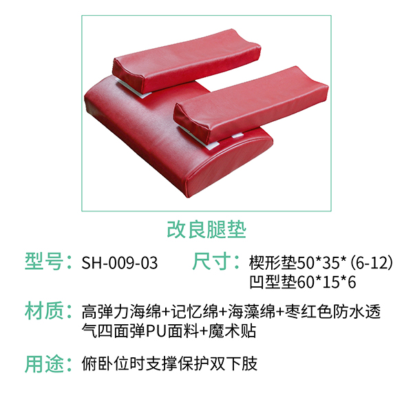 為了避免壓瘡的發(fā)生,手術(shù)室對(duì)俯臥位體位擺放很是嚴(yán)格;故此蒙泰護(hù)理廠家與臨床護(hù)理人員共同研發(fā)與生產(chǎn)了這款海綿改良腿墊;其產(chǎn)品材質(zhì)由:高彈力海綿+記憶綿+海藻綿+棗紅色防水透氣四面彈PU面料+魔術(shù)貼;規(guī)格有:楔形墊50*35*(6-12)、凹型墊60*15*6產(chǎn)品主要用途:俯臥位時(shí)支撐保護(hù)雙下肢